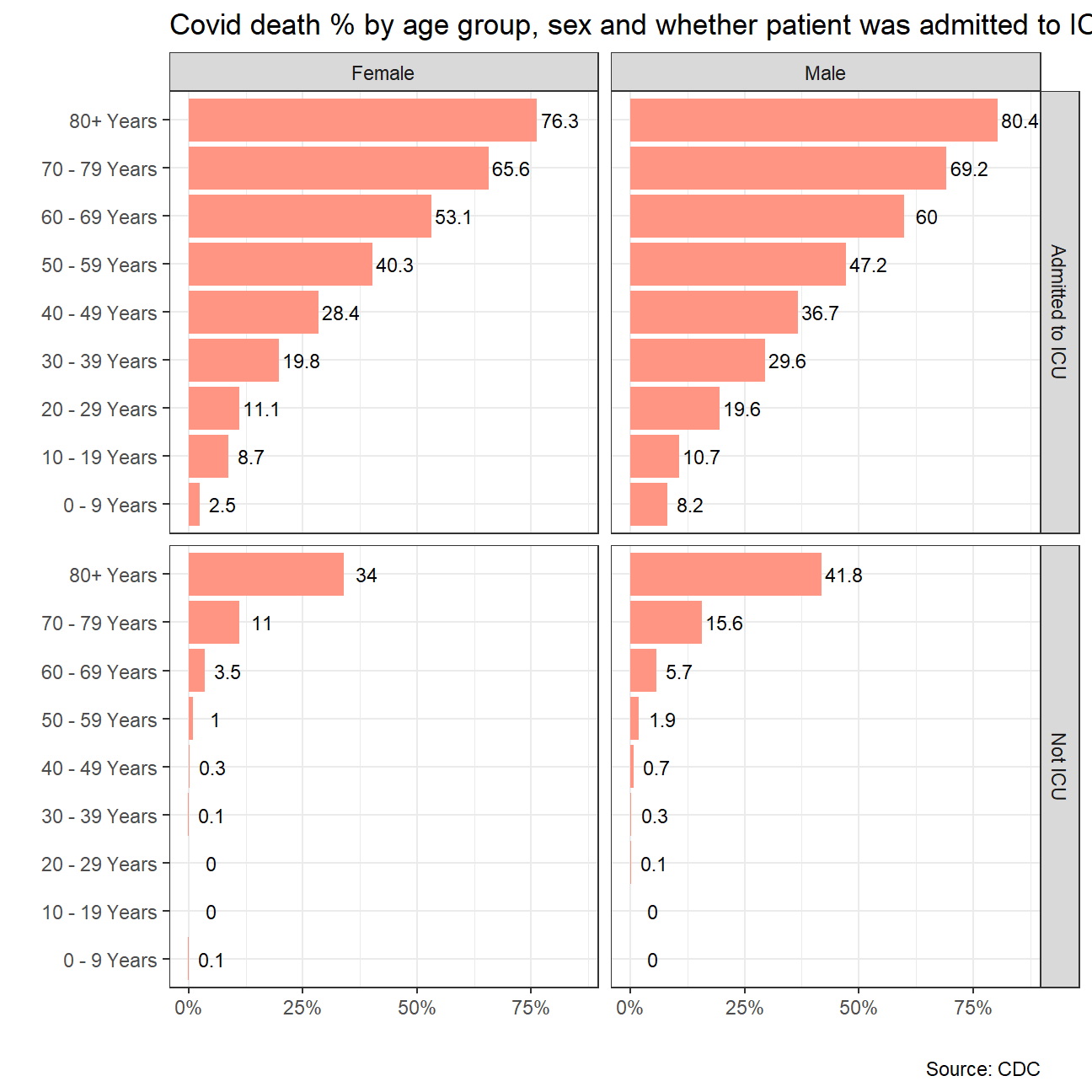 labs(title = "Covid death % by age group, sex and whether patient was admitted to ICU",