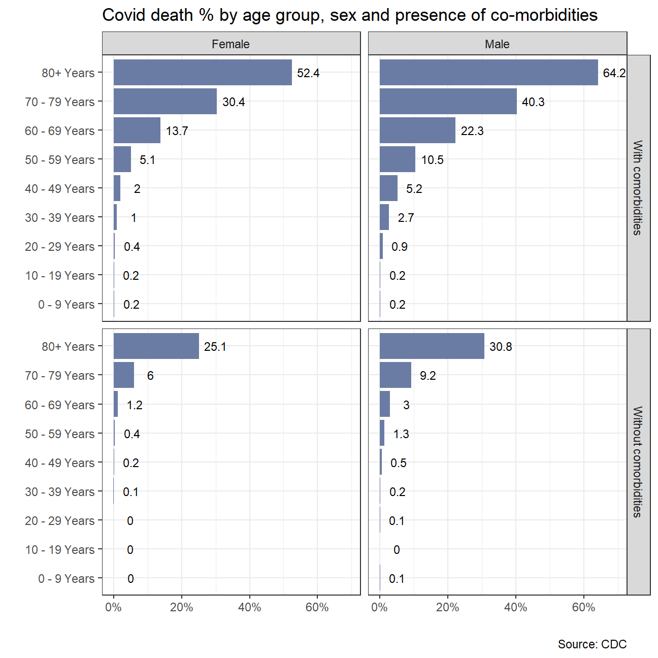 labs(title = "Covid death % by age group, sex and presence of co-morbidities",